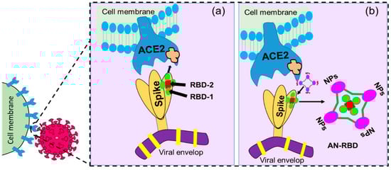 Graphical illustration of (a) receptor-binding domain (RBD)-mediated host cell–virus relationship where RBD-1 is the main part responsible for the binding, and (b) antagonistic nanostructure encapsulated RBD (AN-RBD) inhibiting adhesion.