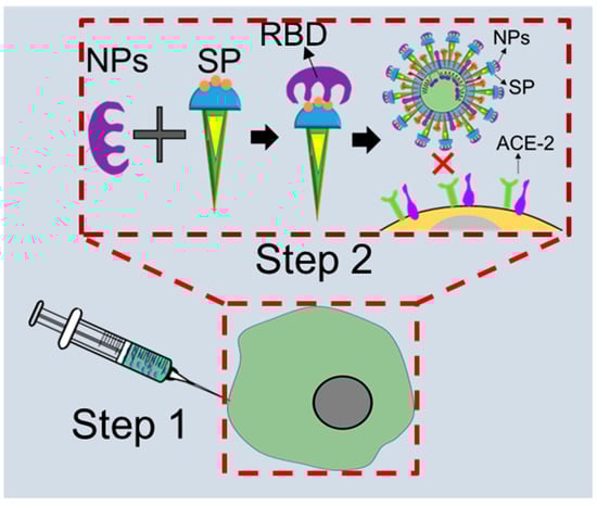 The proposed scope of COVID-19 treatment approaches: (Step 1) injection of functionalized anti-sialic receptor-like nanoparticles (NPs) and (Step 2) NPs and spike protein (SP) of SARS-CoV-2 attach and block the receptor-binding domain (RBD); SP cannot bind to angiotensin convertase enzyme (ACE2) (‘×’ indicates inhibition checkpoint).
