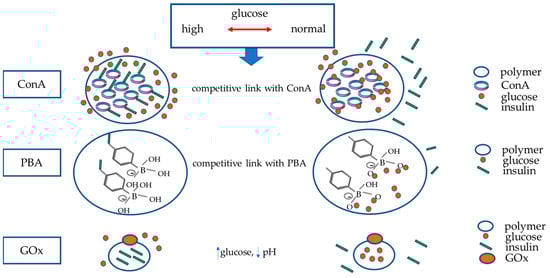 PBA’s reversible binding to glucose provides a potential mechanism for designing insulin formulations that respond to changes in blood glucose concentrations, so various approaches (glucose-triggered swelling, dissociation, competitive replacement) have been conducted to use PBA in GRI systems []. Several matrices (gels, micelles, capsules) have been synthesized with the use of PBA. Thanks to PBA’s ability to switch from a hydrophobic form to a hydrophilic form, insulin may or may not be released in response to glucose levels [].