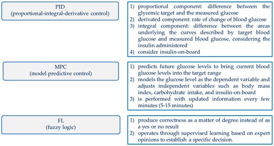 These systems consist of three components: a continuous glucose monitoring (CGM) through an interstitial sensor, a subcutaneous insulin infusion pump, and one or more algorithms that relate these two physical components so that they regulate, with the greatest possible precision, the patient’s blood glucose in the glucose targets defined for the algorithm itself [,]. The key element of the prototypes of AP is the algorithm and, to date, there are three algorithms used for this purpose: Proportional Integral Derivative (PID), Model Predictive Control (MPC), and Fuzzy Logic (FL) (Figure 3).