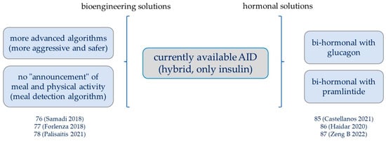 The future of automated insulin delivery systems (AID). Schematic representation of prospects for AID systems. Currently available AID systems are hybrids and use insulin alone. Algorithms that allow the full automation of the system are being tested or the use of other hormones, particularly glucagon [,,,,,].