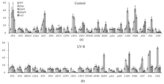 Transcript levels of phenylalanine ammonia-lyase (PAL), chalcone synthase (CHS), elongated hypocotyl 5 (HY5), phytochrome interacting factor 4 (PIF4), cullin 4 (CUL4), suppressor of PHYA protein (SPA), b-box transcriptional facrot 21 (BBX21), phytochromobilin synthase (HY2), cryptochrome 1 (CRY1), cryptochrome 2 (CRY2), anthocyanin synthase (ANT), S subunit of PSII (PSBS), chlorophyll a/b binding protein 1 (CAB1), photosystem II protein D1 (psbA), photosystem II protein D2 (psbD), de-etiolated1 (DET1), E3 ubiquitin-ligase (COP1), phytochrome B1 (PHYB1), ultraviolet-B receptor (UVR8), and repressor of UV-B photomorphogenesis 2 (RUP2) under white fluorescent lamps (a) and under UV-B (311 nm) after 48 h of treatment (b). The transcript levels were normalized to the expression of the Tubulin1 gene. The gene expression in WT was used as one unit. Different letters indicate significant differences (p ≤ 0.05) between the experimental treatments for each gene, n = 3.