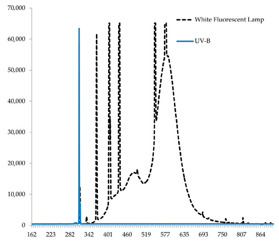 Seed mutants phya LA4356, phyb1 LA4357, phyab2 LA4362, and cry1 LA4359, and wild-type (WT) LA2706 tomatoes were obtained from the Tomato Genetics Resource Center, USA, California were chemicaly stratificated. The resulting seedlings were grown under the conditions of the phytotron climatic chamber, 250 µmol (photons) m−2s−1 (Philips fluorescent lamps TD—L 58 W/33-640 (Pila, Poland) with intensity in the UV-B region 2.3 μmol (photons) m−2s−1 UV-B (Figure 2), in perlite culture, using Hoagland’s nutrient solution, at a 16 h photoperiod, air temperature of 23/18 °C (day/night), and a humidity of 75%. Plants were grown for 3 weeks and then subjected to vegetative propagation by cuttings. The resulting clones, of 5–7 cm high, were rooted in perlite culture for 1 week and used in the main experiments.