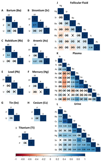 Relationships of ten non-essential trace elements between and within follicular fluid, plasma, and urine. (A–I) Correlation matrices representing the relationships of the non-essential trace elements between biofluids. (J–L) Correlation matrices representing the relationships of the elements within each biofluid. FF, follicular fluid; P, plasma; and U, urine. Blue represents a positive correlation, while red represents a negative correlation. Color intensity is proportional to the correlation strength. Strikethrough values represent non-significant associations (p > 0.05).