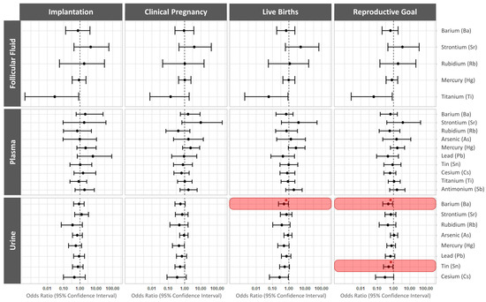 Odds ratios (95% confidence interval) for reproductive outcomes following ICSI and SET/FET. Forest plots present the odds ratios (95% confidence interval) for implantation, clinical pregnancy, live birth per single frozen embryo transfer (SET/FET), and reproductive goal (achievement of a live birth per initiated IVF cycle) across the detectable essential trace elements in each biofluid. * p < 0.05. Significant odds ratios are highlighted in red.