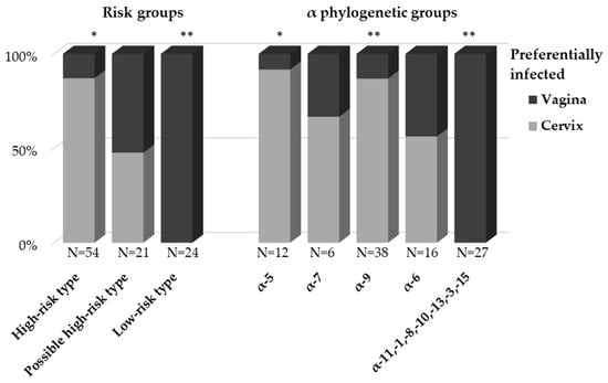 Prevalence of HPV that preferentially infected the cervix or vagina in HPV risk groups and α-phylogenetic groups. ** p < 0.01, * p < 0.05.