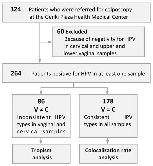 Immediately before colposcopic assessment, a vaginal speculum was used to expose the cervix of each patient, and then the endocervix and portio vaginalis were scraped using an IM sampler instrument (Muto Pure Chemical, Tokyo, Japan) consisting of a spatula and brush and eluted into a collection vial, which was used as the cervical sample. Then, while holding the vaginal speculum open, the bilateral portions from the vaginal vestibule to the upper half of the vaginal canal were scraped with a spatula and collected as the upper vaginal sample, and cells from the lower half of the vaginal canal were collected in the same manner as the lower vaginal sample. Samples were collected after obtaining written informed consent from the patients. The Ethics Committee on Human Research of Kyorin University approved the study protocol, which was implemented in accordance with the approved guidelines. Patients who were negative for HPV in three different samples were excluded, and consequently, 264 patients who were positive for any HPV type in any of the samples were evaluated (Figure 2). The patients were nonpregnant women with a mean age of 40 (range, 22–71) years. Several samples used in the present study had previously been reported in a study of the effects of the menstrual cycle on the accumulation of HPV-infected cells exfoliated from the cervix that drift into the vagina [].