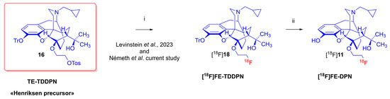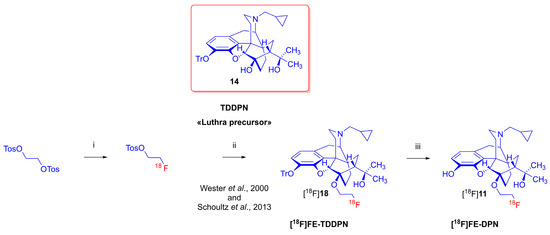 The effective and convenient radiosynthesis of radiopharmaceuticals intended for PET imaging is an important prerequisite for their accessibility. To avoid the disadvantage of indirect radiofluorination of diprenorphine (more synthetic and purification steps), a new precursor, namely 6-O-(2-tosyloxyethyl)-6-O-desmethyl-3-O-trityl-diprenorphine (TE-TDDPN, 16), was developed from TDDPN (14) in three steps by Henriksen et al. [59]. For the synthesis of TE-TDDPN (16), TDDPN (14) was alkylated with 2-bromoethoxy-tert-butyldiphenylsilane (2.3 equiv.) in DMF in the presence of sodium hydride (10 equiv.). In the next step, the TBDPS-protecting group was removed with 1 M Bu4NF in THF at room temperature. The primary hydroxyl group of 6-O-(2-hydroxyethyl)-6-O-desmethyl-3-O-trityl-diprenorphine (HE-TDDPN, 15) was tosylated (Tos2O, pyridine, CH2Cl2), with overall 27% yield of the synthesis from compound 14.