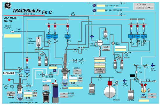 The preparation of [18F]FE-DPN ([18F]11) consists of the following steps: fluorine-18 production, [18F]fluoride separation, radiolabeling, deprotection, semipreparative HPLC purification, formulation, and quality control. Due to inadequate performance of our initial procedures, we sought to improve the radiochemical yield of the [18F]FE-DPN ([18F]11) synthesis by investigating different labeling conditions, i.e., varying factors such as the amount and type of base used to elute [18F]fluoride, precursor concentration, reaction temperature, and reaction time. For the automated radiosyntheses, we used the GE TRA-CERlab FX FE synthesis panel with significant modifications, as presented in Figure 5. While originally designed for electrophile radiosynthesis, we modified it to be suitable for nucleophilic reactions. In particular, we replaced the fluorine–neon inlet with an irradiated water inlet and added a second reactor with several extra valves, which we did not, however, use in these experiments. Moreover, we removed the formulation unit of the panel, in order to have enough reagent vessel for the reaction and the transfer of the reaction mixture for HPLC purification.