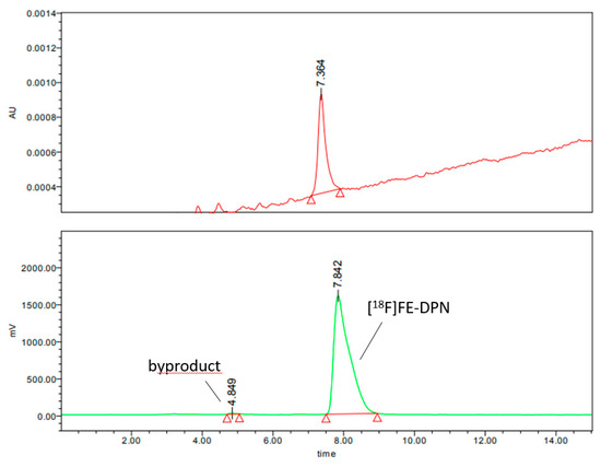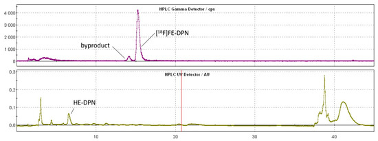 For the quality control of [18F]FE-DPN ([18F]11), we developed two analytical HPLC methods. First, we measured the radiochemical purity of the purified product by gradient elution according to the following parameters: Nucleodur C18 Pyramid 5 µm (250 × 4.6 mm) RP column with eluent A: acetonitrile and eluent B: 0.1 M ammonium formate (pH 6.67). The linear gradient was 0 min: 40% A and 60% B; 8 min: 100% A; 11 min: 100% A; 11.1 min: 40% A and 60% B, at a flow rate of 1 mL/min and a UV recording at 284.5 nm. Figure 7 shows the analytical HPLC chromatograms of the product using this gradient elution.
