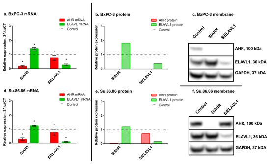 Figure 1. AHR and ELAVL1 qRT-PCR and WB analysis. mRNA and protein expression of AHR and ELAVL1 genes and proteins, after AHR or ELAVL1 silencing by transfection. qRT-PCR N = 3, MEAN ± SD. * p < 0.05. WB N = 3; however, only 1 is shown as a representative experiment: (a) BxPC-3 qRT-PCR analysis, (b) BxPC-3 WB analysis, (c) membrane of BxPC-3 WB, (d) Su.86.86 qRT-PCR analysis, (e) Su.86.86 WB analysis, and (f) membrane of Su.86.86 WB.