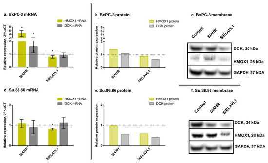 Figure 2. HMOX1 and DCK qRT-PCR and WB analysis. mRNA and protein expression of HMOX1 and DCK genes and proteins, after AHR or ELAVL1 silencing. qRT-PCR N = 3, MEAN ± SD. * p < 0.05. WB N = 3; however, only 1 is shown as a representative experiment: (a) BxPC-3 qRT-PCR analysis, (b) BxPC-3 WB analysis, (c) membrane of BxPC-3 WB, (d) Su.86.86 qRT-PCR analysis, (e) Su.86.86 WB analysis, and (f) membrane of Su.86.86 WB.