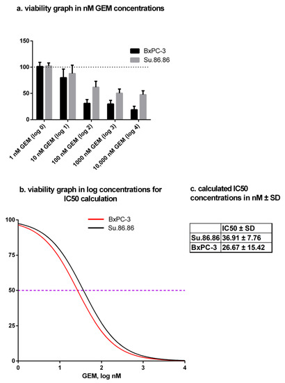 The metabolic activity of PDAC cells was determined by MTT assay. IC50 doses of GEM were determined separately for both cell lines: Su.86.86—36.91 ± 1.40 nM, BxPC-3—26.67 ± 1.69 nM (Figure 4a,b).