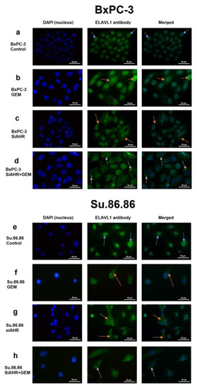 Figure 5. Example photos of PDAC lines ICC with ELAVL1 antibody. Example photos showing the ELAVL1 shift from the nucleus to the cytoplasm after the effect of SiAHR and/or GEM. ICC N = 3; however, only one is being shown as a representative experiment (40× magnification): (a) BxPC-3 control, (b) BxPC-3 GEM, (c) BxPC-3 siAHR, (d) BxPC-3 siAHR+GEM, (e) Su.86.86 control, (f) Su.86.86 GEM, (g) Su.86.86 siAHR, and (h) Su.86.86 siAHR+GEM. Blue arrows depict ELAVL1 protein being localised predominantly in the nucleus. Orange arrows depict ELAVL1 protein somewhat shifting from the nucleus to the cytoplasm. Grey arrows depict ELAVL1 being localised predominantly in the cytoplasm.