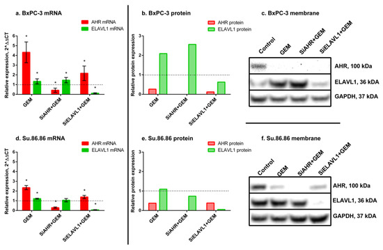 Figure 6. AHR and ELAVL1 qRT-PCR and WB analysis after GEM treatment. mRNA and protein expression of AHR and ELAVL1 genes and proteins, after AHR and/or ELAVL1 silencing by transfection and treatment with IC50 GEM. qRT-PCR N = 3, MEAN ± SD. * p < 0.05. WB N = 3; however, only 1 is shown as a representative experiment: (a) BxPC-3 qRT-PCR analysis, (b) BxPC-3 WB analysis, (c) membrane of BxPC-3 WB, (d) Su.86.86 qRT-PCR analysis, (e) Su.86.86 WB analysis, and (f) membrane of Su.86.86 WB.