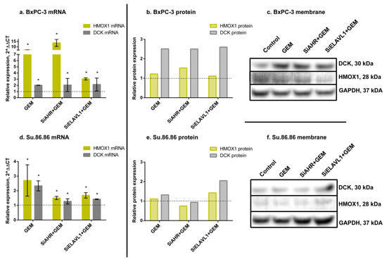 GEM greatly increased HMOX1 mRNA (BxPC-3—7.2-fold; Su.86.86—2.7-fold); however, an increase in protein was much less noticeable (BxPC-3—1.2-fold, Su.86.86—1.1-fold), as well as DCK mRNA (BxPC-3—2-fold, Su.86.86—2.3-fold) and protein (BxPC-3—2.5-fold; Su.86.86—1.3-fold) (Figure 7).
