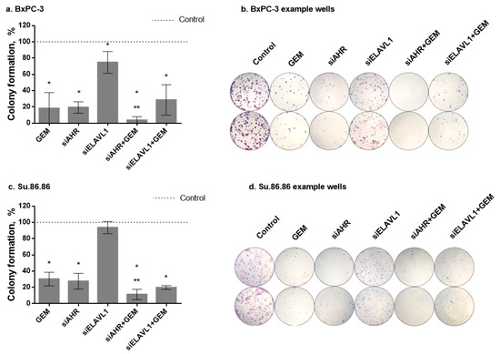 Figure 9. PDAC cell colony formation. Colony formation after silencing AHR or ELAVL1 genes by transfection and/or exposure to GEM. Cells for clonogenic assay were seeded after 24 h transfection and grown for 168 h after seeding: (a) BxPC-3 colony formation graph, (b) BxPC-3 colony formation example photos, (c) Su.86.86 colony formation graph, and (d) Su.86.86 colony formation example photos. N ≥ 4, MEAN ± SD * p < 0.05 when compared with respective control. ** p < 0.05 when compared with GEM alone.
