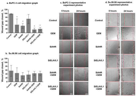 Figure 10. Cell migration by wound healing assay. Two PDAC cell lines showing migratory abilities after the silencing of AHR or ELAVL1 genes and/or effect of gemcitabine: (a) BxPC-3 cell line migration graph, (b) Su.86.86 cell line migration graph, (c) BxPC-3 representative experiment photos (red lines show gap/wound width of photo taken at 0 h), and (d) Su.86.86 representative experiment photos (red lines show gap/wound width of photo taken at 0 h). N ≥ 3, MEAN ± SD. * p < 0.05 when compared with control.