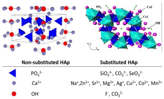 The atomic substitution or doping of HA (Figure 2) is the best approach to also improve the main weaknesses of implants based on HA, mainly the mechanical properties. By performing different types of substitutions, especially anionic (PO43−) and cationic (Ca2+) substitutions, all the drawbacks mentioned before can be solved [].