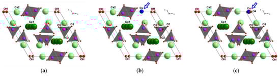 Schematic representation of stoichiometric HA structure (a) of Cu–HA (blue arrow), featuring the localization of the copper cation, either at the site of the calcium cation (b) or in the hydroxyl channel. (c) The arrow indicates the position of the copper atom [].
