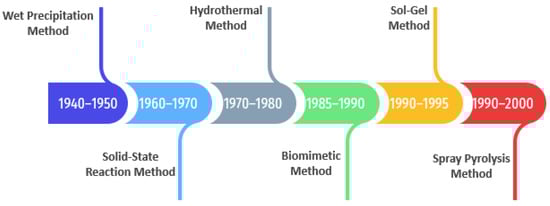 Co-precipitation is another method that is highly studied in HA synthesis. This synthesis pathway aids the formation of the different morphologies of the particles with a low-crystalline nature []. Additionally, wet chemical precipitation represents one of the most used techniques due to its simplicity, cost, and low reaction temperature, in which high ratios of pure product can be obtained. As mentioned by numerous researchers, this technique depends on the mechanism of growth–agglomeration–nucleation–aggregation–agglomeration. The procedure beings with the preparation of alkaline (Ca source) and acid (P source) solutions, continued by the reaction between them. Next, there are the stages of precipitation, filtration, drying, and, finally, heat treatment, respectively []. The obtained materials through this method were proved to increase bone regeneration, surface absorption, and mechanical properties. On the other hand, more efficient synthesis methods with simplified preparation procedures and short duration are needed [].