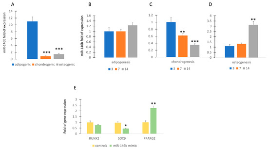 MiR-146b expression during differentiation. MiR-146b expression is higher in MSCs committed to adipogenic lineage compared to chondrogenic or osteogenic lineage (miR-146b expression in chondrogenic or osteogenic groups compared to adipogenic group) (A). MiR-146b expression is poorly modulated during adipogenesis (miR-146b expression at 7 or 14 days of differentiation compared to 3 days of differentiation) (B) and highly modulated during chondrogenic (C) or osteogenic (D) differentiation. Forced expression of miR-146b induced the upregulation of PPARG2 and the downregulation of SOX9 (E). Data are shown as mean ± standard deviation (SD); * p < 0.05; ** p < 0.01; *** p < 0.005. For each experiment, six independent analyses were performed. In figure (B–D), miR-146b expression at 7 or 14 days of differentiation is compared to that at 3 days of differentiation.
