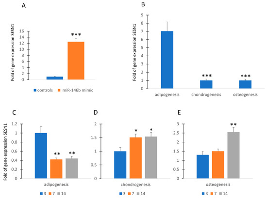 MiR-146b and SESTRIN. Forced expression of miR-146b increased SESN1 gene expression in MSCs (A). SESN1 is upregulated in adipogenic committed MSCs (B). SESN1 expression was downregulated during adipogenesis (C) and upregulated during chondrogenesis and osteogenesis (D,E). Data are shown as mean ± standard deviation (SD); * p < 0.05; ** p < 0.01; *** p < 0.005. For each experiment, six independent analyses were performed.