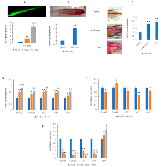 MiR-146b expression during zebrafish maturation. RT (real-time)-PCR analyses. MiR-146b expression after 3 (3d; sample n = 30), 7 (7d; sample n = 30), and 14 (14d; sample n = 30) days post fecundation (A). Expression levels of miR-146b at 2 (sample n = 30) and 6 months (sample n = 30) (B) and in young (sample n = 30), middle-aged (sample n = 30), and old zebrafish (sample n = 30) (C). Osteogenic (runxa, runxb, sp7), chondrogenic (sox9), and the receptor for RANK-Ligand gene expression increased during the maturation of larvae (D). Runx2a and sox9 gene expression was downregulated in 6 months compared to 2 months old zebrafish (E). Osteogenic or chondrogenic differentiation associated genes lowered in caudal fin during the aging (E). Rank gene expression, involved in osteoclast activation, was higher in the caudal fin of middle-aged and old zebrafish (F). Data are shown as mean ± standard deviation (SD); * p < 0.05; ** p < 0.01; *** p < 0.005. (A): Calcein staining of zebrafish at 14 days post fertilization. (B): Alizarin staining of zebrafish at 6 months of age. In particular, at 14dpf the miR-146b increased more than 8-fold compared to 3 dpf (A). Therefore, we evaluated the miR-146b expression in adult caudal fin of zebrafish, a model system for the evaluation of molecular mechanisms involved in regeneration [18]. In particular, miR-146b expression was evaluated in young (n = 30; 10–12 months), middle-aged (n = 30; 20–24 months), and old (n = 30; 30–36 months) zebrafish samples.