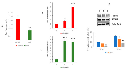 Circulating miR-146b expression in healthy human subjects. RT (real-time)-PCR in circulating miRNAs isolated from female (sample n = 12) and male (sample n = 17) (A) or in female (B) or in male (C) of different ages. Sestrin 1 and Sestrin 2 protein levels in MSCs cultured in presence of sera collected in women of different ages (D). (Median age: women 41.4 ± 7.2 ((group a (n = 4) 27.8 ± 1.9; group b (n = 4) 41.2 ± 1.9; group c (n = 4) 52.8 ± 0.8)); men 41.7 ± 9.7 ((group a (n = 5) 28.4 ± 1.1; group b (n = 6) 42.5 ± 0.8; group c (n = 6) 52.8 ± 0.63)). The original blots are presented in Supplementary S1. * p < 0.05; ** p < 0.01; *** p < 0.005.
