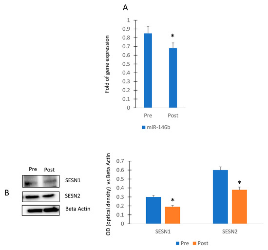 Walking program performed by female participants and miR-146b modulation. RT (real-time)-PCR in circulating miRNAs (Pre) and after (Post) the exercise program (A). Sestrin 1 and Sestrin 2 protein levels in MSCs cultured in presence of sera collected before (Pre) and after (Post) the exercise program (B). The original blots are presented in Supplementary S1. Data are shown as mean ± standard deviation (SD); * p < 0.05.