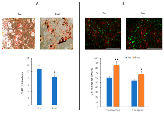 Effects of sera in differentiating cells. MSCs cultured during adipogenesis in presence of sera collected before (Pre) or after (Post) the exercise program. ORO-stained area in cells in presence of Pre and Post sera stimulation (A); 3D cultures of chondroblasts (green) and osteoblasts (red) in presence of Pre and Post sera stimulation (B). The increased chondroblast intensity observed in the post-treatment phase may potentially be attributed to cell overlap. Data are shown as mean ± standard deviation (SD); * p < 0.05; ** p < 0.01;. Magnification 10× (A) and 20× (B).