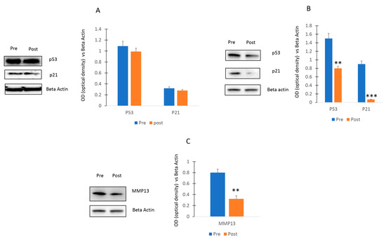 As shown in Figure 7A, no differences of p53 and p21 levels were observed in osteogenic cells cultured with Pre or Post sera. In contrast, a decrease of the p53/p21 pathway (Figure 7B) and a reduction of MMP13 levels (Figure 7C) was observed in chondroblastic progenitors cultured with serum post exercise program.