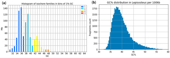 We plotted isochore families (isofamilies) in the genome assembly of two gar species [34,58] using the Python tool isoSegmenter [9]. This tool, in its default setting, utilizes the non-overlapping sliding window size of 100 kB. In parallel, we produced a simple histogram of GC% values based on the same genome assemblies with the same sliding window size as the isofamilies produced with the isoSegmenter tool. Here, the gar genome assemblies were chosen because of the already proven AT/GC heterogeneity of this peculiar ancient fish species [5]. Hence, it was highly relevant and desirable to plot isofamilies for this species. We produced histograms with the same sequence size (i.e., the sliding window size) for further fish and fish-like species listed below using our tailored Python scripts.