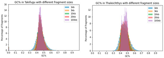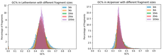 To visualize the effect of the sliding window size on the distribution of GC% values, we merged histograms originating from five different window sizes into single plots in a panel of fish and fish-like species with highly diversified genomes sizes, GC% and overall genome organization sensu [37]. The selected species include the highly fragmentary and GC-rich genome of lamprey with numerous tiny chromosomes (Lethenteron reissneri, ca. 1 Gbp, GC = 48.74%) and an ancient polyploid genome of sturgeon (Acipenser ruthenus, ca. 1.8 Gbp, GC~40%) in Figure 2.