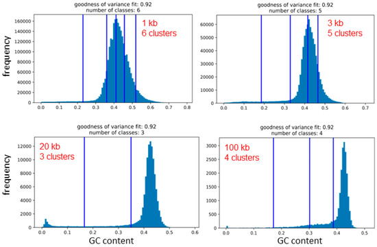There are established statistical methods for clustering data into natural clusters (or groups), i.e., without any user input. One of them is the Fisher–Jenks breaks method that enables comparison plots of isofamilies (i.e., arbitrarily determined clusters of GC% values) with the resulting natural clusters of GC% values between the natural breaks. Here, we scanned the entire genome of twelve species with five different non-overlapping sliding window sizes 1 kb, 3 kb, 10 kb, 20 kb, and 100 kb (Table 1). Then, we calculated the GC% for each sequence and used these values for the Fisher–Jenks breaks method plotted as histograms with the natural breaks (Figure 5). The selected window size clearly governed the resulting counts of the natural breaks between GC% values. The counts of clusters corresponding to isofamilies range between three to seven in the species under study (Table 1). For single species, at least two different counts of natural clusters occur, with an exception in bowfin, where all sequence sizes resulted in five clusters. In the Atlantic salmon, four different counts of clusters were identified (3–6; Figure 5). The resulting clusters of GC% values are delimited by vertical bars representing the natural breaks (Figure 5). Each natural cluster corresponds to the range between two of these bars or between the bar and the border of the graph. The clusters have a high support of the values of the goodness of variance fit (GVF), reaching 0.92 where GVF = 1 means the perfect fit.