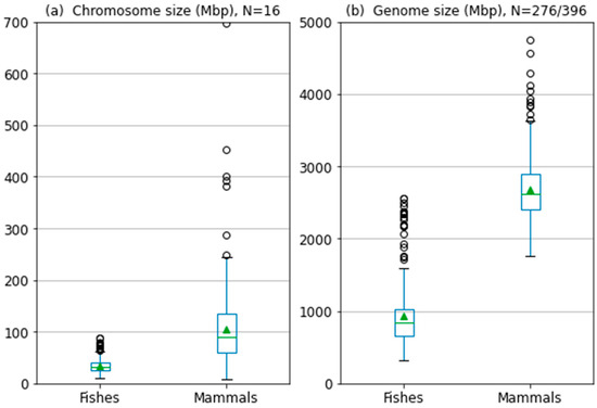 Comparison of chromosome and genome size in fish and mammals. (a) Chromosome size in 16 teleost fish and 16 mammalian species available at NCBI/Genome [39]. (b) Genome size in 276 teleost fish species and 396 mammalian species available at NCBI/Genome. Note: the outliers (circles) in teleosts are palaeopolyploid salmonids. Green triangles represent mean values.