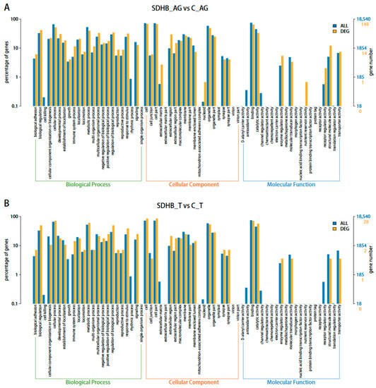 GO classification of the unigenes and DEGs discovered: (A) “SDHB_AG vs. C_AG”; (B) “SDHB_T vs. C_T”. The abscissa shows the second level terms in the three GO categories. The ordinates show the number of genes annotated to each term and the percentage of all genes.