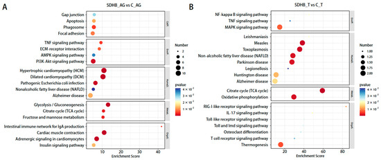 KEGG enrichment of DEGs: (A) “SDHB_AG vs. C_AG”; (B) “SDHB_T vs. C_T”. The size of the dots represents the number of genes. The color of each dot represents the p-value. The abscissa shows the enrichment score. The ordinate shows the number of genes annotated to each term and the percentage of all genes.