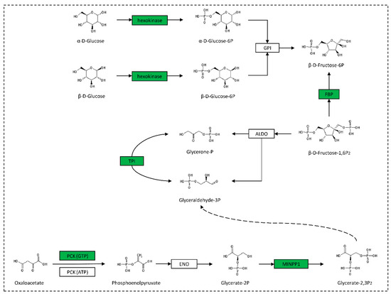 Schematic diagram of a partial glycolysis/gluconeogenesis pathway. The green boxes represent genes that are downregulated in the androgenic gland of Macrobrachium nipponense.