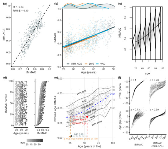Figure 1c visualizes the IMMAX distributions estimated by GAMLSS for selected values of chronological age. They did not only vary by location, as indicated by the curvilinear increase in the medians with age but also by shape and spread. Whereas the IMMAX centiles correlated with the biomarker values via the age-dependent cumulative distribution functions (Figure 1d, right panel), they were uncorrelated with age by construction (Figure 1d, left panel). The resulting percentile curves in Figure 1e, with centiles chosen at intervals approximately 1 SD apart for a Gaussian distribution [27], provided reference intervals defining ordered categories of fast (or accelerated) and slow (or decelerated) immunological aging, respectively. Immune age on an equivalent-years-of-life (EYOL) scale for given values of age and immune age biomarker IMMAX could then be defined as the chronological age yielding the identical IMMAX value on the reference curve, chosen as P50 (Figure 1e). The immunological age gap was then calculated as the difference between immune age and chronological age. Scatterplots in Figure 1f showed a perfect correlation between IMMAX and EYOL following the non-linear course of the reference curve P50, which had to be extrapolated to very high and even negative age for mapping the whole zero-to-one range of IMMAX to EYOL values (Figure A1 in Appendix A). IMMAX centiles almost perfectly correlated with the age gap, while the correlation of the age gap with IMMAX mirrored the relation of IMMAX with the IMMAX centiles from Figure 1d. Thus, while EYOL is a re-scaled version of the biomarker IMMAX, the age gap almost perfectly substituted the IMMAX centiles, with negative values representing slow aging and positive age gaps indicating fast or accelerated immunological aging, respectively. Both the centiles and the age gap were uncorrelated with chronological age (Figure 1d), confirming the independence of this characterization of immunological aging from chronological age.