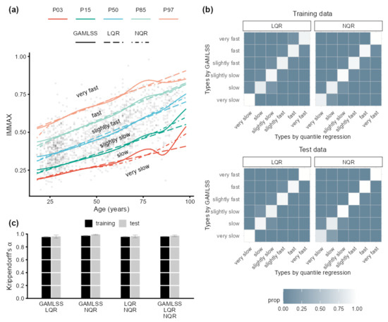 Individual centile values are not necessarily required for the determination of aging type and age gap, which rely on pre-specified percentile curves only (Figure 1e). Such curves defining reference intervals can be fitted by different modeling strategies in addition to GAMLSS, e.g., by linear quantile regression (LQR) [29] or non-parametric quantile regression (NQR) employing regression splines [30]. Figure 2a compares the resulting percentile curves for the three algorithms, which showed quite a similar trend in the low to median age range. At old age, the GAMLSS curves for high and low percentiles wriggled compared to the smooth curves for LQR and NQR, probably due to the higher sensitivity of the GAMLSS algorithm to data sparsity at high age. These differences only had negligible consequences on aging type classification, as shown by Figure 2b, indicating that the different models classified the overwhelming proportion of individuals to identical aging types, with misclassifications only occurring between neighbored categories. Figure 2c quantifies this excellent agreement by values of Krippendorff’s α [32] above 0.9 for all comparisons. The corresponding results for the test data in Figure 2b,c corroborated the outcome for the more comprehensive training data.