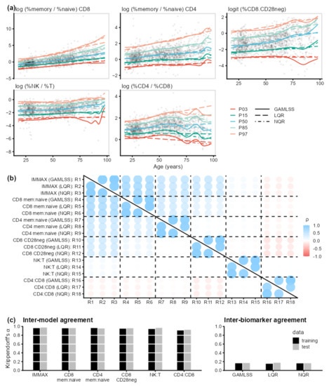 The high agreement between the three modeling strategies for estimating percentile curves was confirmed when repeating the analyses for the five immune age biomarkers used for the calculation of IMMAX (Figure 3). On the other hand, concerning inter-biomarker agreement, Krippendorff’s α comparing aging type classification by the six biomarkers dropped to values below 0.2 independently from the chosen algorithm (Figure 3c, right panel), towards zero, which marks the expected coincidence of the ratings due to chance [32]. Bivariate correlation analysis (Figure 3b) revealed considerable heterogeneity between the rating algorithms, with ratings based on the memory-to-naïve ratio of CD8 cells similar to those using IMMAX, whereas close to zero, or even negative correlations with IMMAX-based ratings occurred for the NK:T cell and CD4:CD8-ratios, respectively.