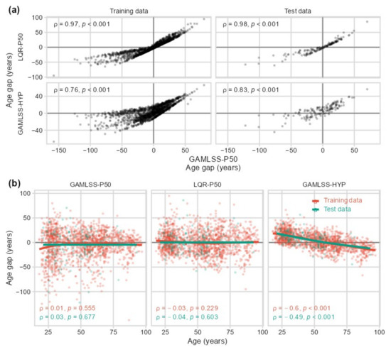 Similar to aging type rating, the alternative models could also be applied for defining reference curves, usually taken as the median (P50), when calculating EYOL and age gap. Figure A1 presents the resulting curves for linear quantile regression (LQR) in addition to GAMLSS showing that with both approaches, the P50 curve needed extrapolation beyond the limits of adult age for determining EYOL over the whole zero-to-one range of the immune age biomarker IMMAX. For NQR, the extrapolation was not feasible due to the class of spline functions utilized by this model [30]. In search of an algorithm keeping EYOL values in the adult age range, we defined a hypothetical reference curve based on the IMMAX centiles calculated by GAMLSS (GAMLSS-HYP). Here, we assumed a percentile profile progressively increasing with age starting with the 0.5% percentile at the age of 19 years rising to the 99.5% percentile at 99 years by 1.24% per year, with the minimum value (0) assigned to 18 years and the maximum (1) to 100 years of age (Figure A1). The resulting age gaps based on P50 from GAMLSS and LQR were almost perfectly correlated and exhibited a coinciding switch from negative to positive values (Figure 4a), while correlations for GAMLSS-HYP were lowered, accompanied by a blurred transition from negative to positive age gaps (Figure 4a). In addition, the progressively increasing profile of reference percentiles in GAMLSS-HYP reduced the range of the corresponding age gap values compared to GAMLSS-P50 and LQR-P50 but induced a negative correlation with age (Figure 4b). On the other hand, similar to the IMMAX centiles (Figure 1d), age gaps based on GAMLSS-P50 and LQR-P50 were uncorrelated with chronological age (Figure 4b). In any case, the outcomes for the test data matched and supported the results from the training data.