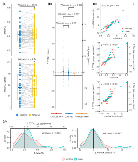 IMMAX increased significantly at the 5-year follow-up, whereas no significant change was observed for the centiles (Figure 5a, Table A2). These outcomes were mirrored on the years-of-life scale (Figure 5b) by significantly positive ΔEYOL and no significant change in the age gap. For the 50th percentile reference curves (GAMLSS-P50, LQR-P50), the values of ΔEYOL conformed to the 5-year follow-up period (Table A2). Although the corresponding changes in the hypothetical reference (GAMLSS-HYP) were lower compared to the other reference curves, these differences were not statistically significant (Figure 5b). In addition to the algebraic identity between ΔEYOL and ΔAge gap, changes from baseline (Δ) in IMMAX, IMMAX centiles, EYOL, and age gap were highly correlated (Figure 5c). No significant sex effects could be established, neither concerning the correlation (Figure 5c) nor between the distributions of the longitudinal changes, which might be related to the sample size limitations of these preliminary data (Figure 5d).