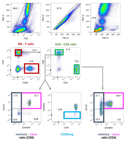 Gating strategy for the derivation of immunosenescence biomarkers by flow cytometry. EDTA blood was stained with a fixable viability dye (FVD) and for the indicated markers, which were calculated from relative cell frequencies: ratios of NK to T cells, CD4pos to CD8pos T cells, and memory to naïve CD4 and CD8 T cells, respectively, and the frequency of CD28neg–CD8pos T cells.