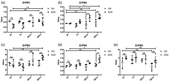 S1PR2 expression increases in contact dermatitis. Gene expressions of S1PR1 (a), S1PR2 (b), S1PR3 (c), S1PR4 (d), and S1PR5 (e) in the skin of control subjects (0 h, n = 3; 7 h, n = 5; 48 h, n = 4; 96 h, n = 4) and contact dermatitis subjects (0 h, n = 4; 7 h, n = 5; 48 h, n = 3; 96 h, n = 6) (GEO: GDS 2935) were analyzed. Data are expressed as means ± SD. *, p < 0.05; **, p < 0.005; ns, not significant; S1PR1-5, Sphingosine 1-receptor1-5.