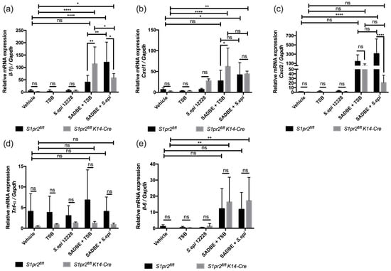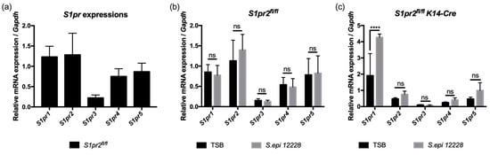 mRNA expressions of S1pr1-5 of murine auricle skin. Total RNA was obtained from S1pr2fl/fl mouse normal ear skin (a), S1pr2fl/fl mouse ear skin 96 h after TSB or S. epidermidis application (b), and S1pr2fl/fl K14-Cre mouse ear skin 96 h after TSB or S. epidermidis application (c). Expressions of five receptors for S1P (S1pr1-5) mRNA were measured with RT-qPCR and normalized to Gapdh mRNA expression level. Three mice were used per experimental group and triplicated technically during analysis. Data shown are the mean ± SD (n = 3) and are representative of two independent experiments with similar results. ****, p < 0.0001; ns, not significant; TSB, trypticase soy broth; S. epi, Staphylococcus epidermidis; Gapdh, glyceraldehyde-3-phosphate.