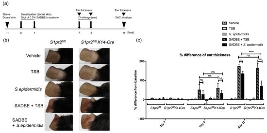 Allergic contact dermatitis (ACD) is one of the most frequent skin inflammatory diseases caused by repeated allergen exposures. Our data show that the level of S1PR2 in the skin goes up during ACD, which suggests that this increase is a natural response to help repair the skin barrier. An efficient skin barrier is the principal protection against a variety of allergens and can prevent ACD formation []. Although a large variety of haptens in chemicals, dyes, drugs, and metals cause ACD, the only treatment option is the administration of corticosteroids and the avoidance of allergen exposures []. However, long-term topical corticosteroid treatments increase the risk of adverse effects, including cutaneous atrophy and telangiectasias []. This study focuses on the role of epidermal S1PR2 together with S. epidermidis in ACD, where the skin barrier is impaired. Our results show that S. epidermidis improves the skin barrier and suppresses the inflammation of ACD to compensate for S1PR2 deficiency in the skin.