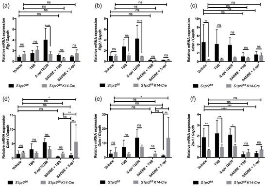 As both S1PR2 and S. epidermidis have been reported to affect the skin barrier function [,,], we investigated whether S1PR2 and S. epidermidis interaction affects the skin barrier function in ACD. According to a previous study [], we measured mRNA expressions of Flg, Flg2, and corneodesmosin (Cdsn), which are components of the stratum corneum barrier, and Cldn1, Ocln, and Zo-1, which are components of the tight junction barrier (Figure 5a–e, Supplementary Figure S2). Similar to the previous study, S1pr2fl/fl K14-Cre mice showed significantly lower mRNA expressions of Cdsn and Zo-1 than S1pr2fl/fl mice with vehicle treatment on the intact skin (Figure 5c,f). On the other hand, no difference was observed in the mRNA expressions of all skin barrier proteins between TSB-treated S1pr2fl/fl ACD mice and TSB-treated S1pr2fl/fl K14-Cre ACD mice. However, S. epidermidis increased mRNA expressions of Cldn1 and Ocln in S1pr2fl/fl K14-Cre ACD mice but not in S. epidermidis-treated S1pr2fl/fl ACD mice. This indicates that S. epidermidis increases the tight junction protein expression in ACD of S1PR2 deficient skin. (Figure 5d,e). Taken together, S. epidermidis ameliorates ACD inflammation in S1PR2 deficient skin through tight junction recovery.
