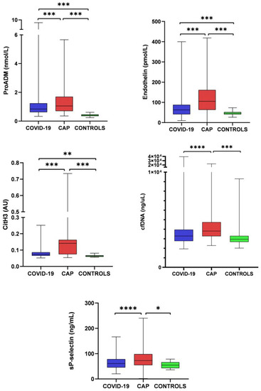 Thus, we aimed to analyze endothelial biomarkers (endothelin and proadrenomedullin (proADM)), NETs (cell-free DNA (cfDNA) and citrullinated histone H3 (CitH3)), and platelet activation (soluble P-selectin (sP-selectin)) during the acute phase of SARS-CoV-2 pneumonia and compare such findings with a matched historical cohort of CAP patients. We also aimed to explore their association with clinical outcomes.